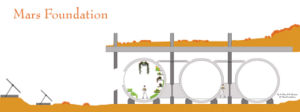 The Mars Foundation concept for a greenhouse involves the maximum use of local materials to avoid waste, maximize energy input and optimize space. Spawned from the Hillside settlement design, the greenhouse would most likely be located inside/next to a hill side (possibly in the location of Candor Chasma). Therefore regolith or some other absorbent material could be suspended above the greenhouse to protect occupants and plants from harmful radiation and slow heat loss. (For radiation, about 2 meters of packed soil would be needed.) The source of light would therefore be directed from the side, via an array of adjustable mirrors. A system of vents and ducts would allow warm air to circulate, perhaps even used to heat the main habitat.
